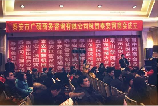 2015年1月26日,泰安市網(wǎng)商協(xié)會成立大會在泰安寶龍福朋酒店隆重舉行。參會的有泰安市政府領(lǐng)導(dǎo)、泰山區(qū)區(qū)委書記和阿里巴巴北方區(qū)域、泰安市商務(wù)局、泰山區(qū)商務(wù)局、市建行、泰山學(xué)院、山東科技大學(xué)、市外網(wǎng)商會等多家單位的主要領(lǐng)導(dǎo)以及泰安網(wǎng)商會全體會員。